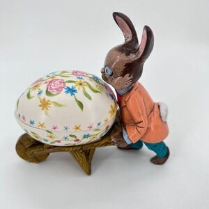 Vintage Anthropomorphic Rabbit Pushing Easter Egg in Wheelbarrow Trinket Box Figurine