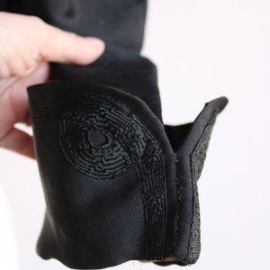 Stunning Victorian mourning bodice jacket. Jacquard Ribbon trim down the front, and solid black trim at cuffs and hem and round the neckline. Hooks and eyes all down the front, but just three at the top. Bottom potion has none and it appears as though there never were any. Slight leg o mutton sleeve, tapering to a cuff. Lined in gold. I believe the jacket is a textured silk, and the lining cotton. No label. Later 1800s. Wonderful rare larger size too!