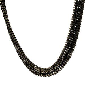 This antique brass tone necklace offers a sophisticated touch to any ensemble.
