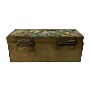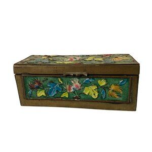 An elegant brass box adorned with vibrant hand-painted floral motifs, offering a delicate storage solution for small treasures and personal mementos.