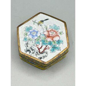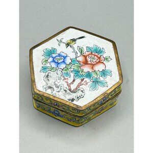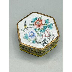 Vintage Antique Hexagon Chinese Enamel Trinket Box Yellow Flowers and Bird