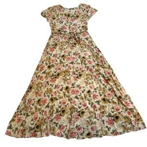 Elegant vintage antique ankle length maxi dress with a mixed floral pattern. Features a lace trimmed collar. Has a tie at the back to adjust to your waist size. Great condition. Marked size 3. See measurements to ensure proper fit.