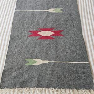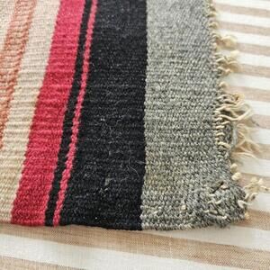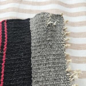 I do not know the tribal affiliation details or specific age, but i was told it's antique by the original owner. There are a couple of issues to note. First is the red ink that has run a little from the pattern in the center. Second, there is a repaired tear on the edge of the center about an inch long. There is also a little damage on the end with the red stripes. There is a thumbtack still in the fabric from an old hanging job. There is also a little staining on one side of that area. Please see all photos for condition and sizing specifics.