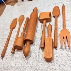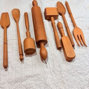 Vintage Antique Primitive Wooden Kitchen Utensils With Hooks Lot Of 8pcs