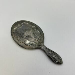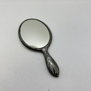Vintage Antique Small 4 in Handheld Mirror "Alexa" Roses Pewter Signed RB?