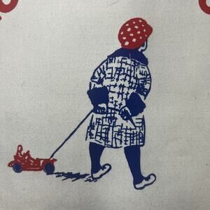 • 2-color (red and blue) graphic print says "I love old toys - Toys are my bag" and features a child with a pull toy