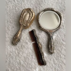 SEO Keywords: vintage vanity set, antique mirror, brush and comb set, Art Deco design, silver vanity set, elegant grooming tools, vintage home decor, collectible vanity accessories.