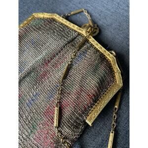 This vintage Whiting & Davis purse is a stunning piece that perfectly captures the glamour of the 1920s. The purse is made of mesh material and features a beautiful multi-color design. Measuring 4 inches by 5 inches, it is the perfect size for a night out on the town.