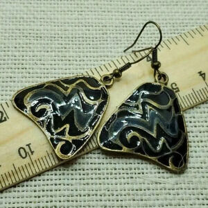 Vintage Antiqued Enamel Earrings Gray and Black TriangleVintage antiqued brass metal pendant earringsHandcrafted and hand enameledArt deco style graphic lines designPD 3367