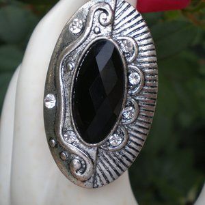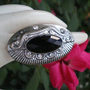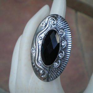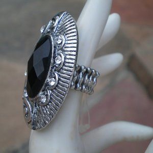 Beautiful Vintage Ring from the 1980's. Never been worn. Antiqued Silver tone with stretch band, one size fits most with faceted Black center stone surrounded by rhinestones ,