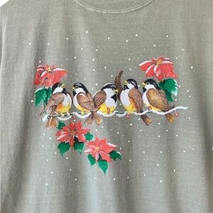 Vintage Anvil Green Holiday Bird Poinsettia Cotton Tee Shirt Size Large