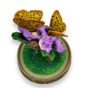 Vintage Aphrodite Fritillary butterflies in bell jar dome. Excellent vintage condition! Two beautiful Aphrodite Fritillary butterfly statues on purple flowers enclosed in a glass bell jar cloche dome.. Measures 5" tall and 3.5" in diameter.