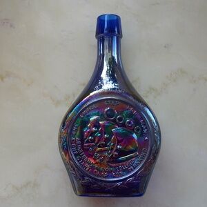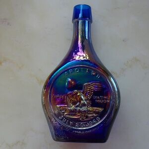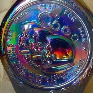 Vintage cobalt carnival glass bottle commemorating the Apollo 11 moon landing of 1969.