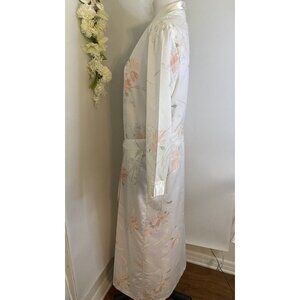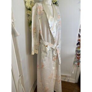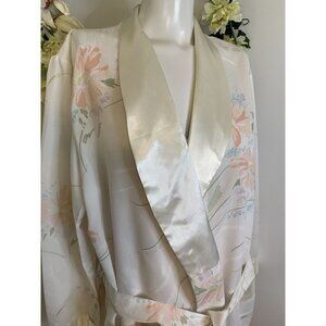 Vintage Appel Robe Medium Floral Print Cotton Blend Satin Union Label Pockets. Vintage 1970-80s Appel cream, peach, and green floral print . Lightweight. Tie belt at waist. ( Size tag is faded, size Medium.) Otherwise in Excellent condition!!! Measurements are taken flat. Pit to pit: 23" Length: 57". Sleeves: 23" L. Opening: 10".