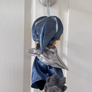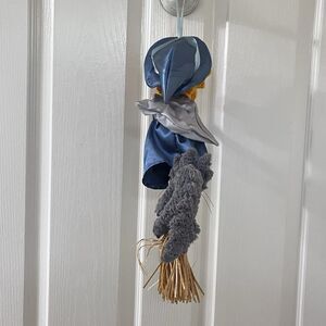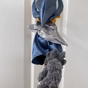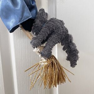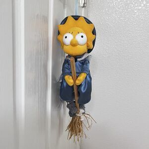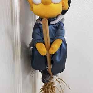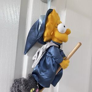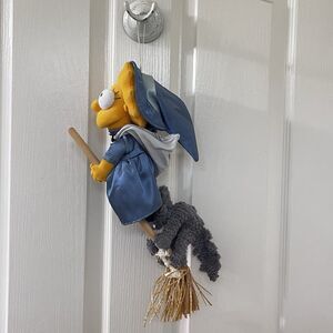 Vintage Applause Witch Lisa Simpson on Flying Broom with Cat Plush Halloween 2003. Such a cute piece, perfect for Halloween. Lisa Simpson is dressed as a witch riding the broom with a cat on the broom as well. Vintage piece that has been stored for a while, so the end of the broom is a little crazy, some stains on the loop that you hang Lisa with, her outfit and cape is very wrinkled, and I believe that she initially made noise when you squeezed her, but no longer makes noise. Please See the Pictures. Far from perfect, but still has a ton of life left.