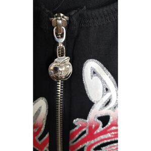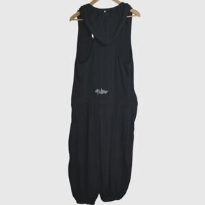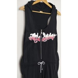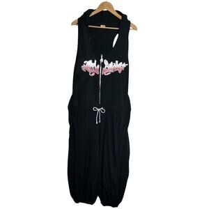In excellent condition vintage 90's or Y2K Apple Bottoms black jumpsuit size 2X. Graffiti spellout with silver glitter, apple on front zip, and lower back hit in silver embroidery. Racer back with fitted hood, elastic waist hits lower and has silver tie, balloon style pant legs with button. Perfect for dancing, roller skating, cute street wear/ lounge wear/woekout.