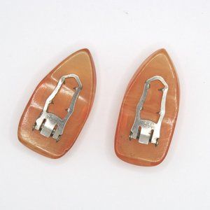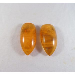 These are 2 collectable vintage apple juice color Bakelite dress clips.