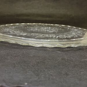 This vintage footed cake plate from Sovereign House features a beautiful Apple Blossom pattern in clear frosted glass. The 11.5”diameter plate is perfect for serving cakes and desserts on all occasions, adding a touch of mid-century modern style to your table setting.
