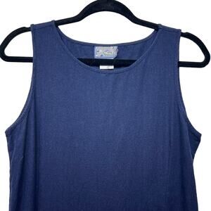 April Cornell women's vintage dress in navy blue. Pullover. Round neck. Sleeveless. Ruffle hem. Unlined. Maxi length. Tie detail in back. In good used condition. No stains, tears or holes.