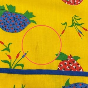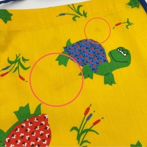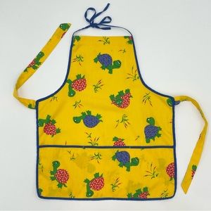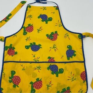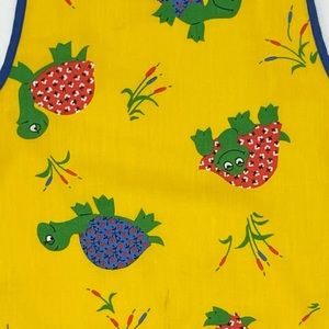 Child's vintage yellow handmade apron with happy little turtles all over. Ties at neck and waist. No materials tag, would guess to be cotton.