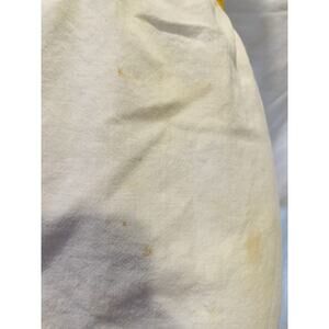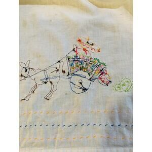 "Discover a charming handmade half apron featuring a whimsical Spanish scene with a flower-cart-driving donkey. Vibrant yellow accents highlight the waist and hem, complemented by meticulously attached ric rac in accenting colors. While showcasing exquisite craftsmanship, the apron does exhibit some flaws, including stains (highlighted in pictures), mysterious marks on the inside band, and slight unraveling of a red ric rac. Despite imperfections, this 17.5" x 24.5" apron, with 24" long ties, is a delightful testament to the artisan's dedication and creativity. Explore its unique character through detailed images."