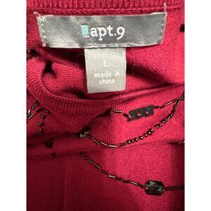 Elegant Apt. 9 burgundy wine wrap layered sweater, size L. Features black sequined, long sleeves, a knitted and smooth pattern, crafted from a rayon nylon blend. Perfect for women's wardrobe.