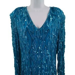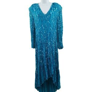 Vintage aqua blue beaded/sequin dress with long sleeves and a ruffle hemline