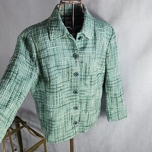 This gorgeous aqua and gray vintage piece features gorgeous buttons, two pockets and is fully lined.