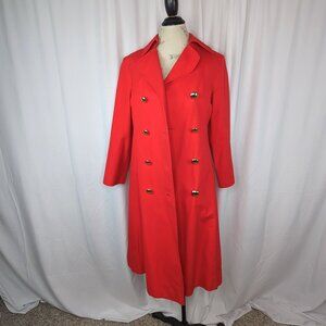 Vintage 1960s Aquascutum of London Fire Engine red canvas trench coat with gold plastic buttons