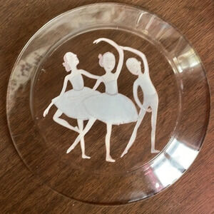 Vintage Arcoroc France glass plate, matching cup and bowl painted with ballerinas in excellent condition. This is the perfect gift for the dancer in your life,