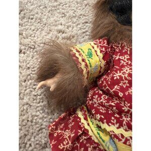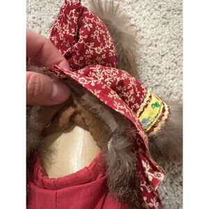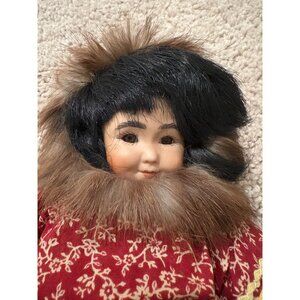 A small porcelain doll that looks ready to brave the tundra or your shelf. Dressed in vibrant red and yellow, featuring faux fur trim for added coziness. It’s like a tiny fashionista Eskimo for your collection.