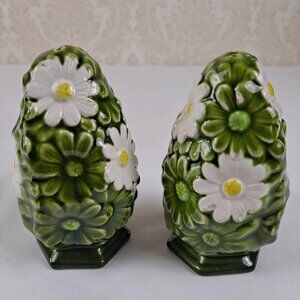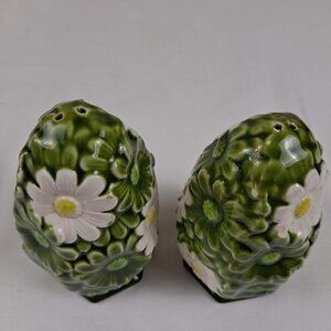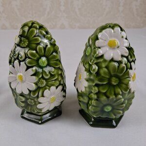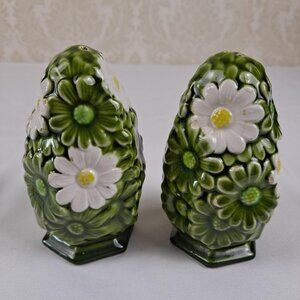Set of salt and pepper shakers in the Daisy pattern from Ardco. Green and white daisies cover the entire piece. Plastic stoppers in the bottom. Please remember that these are vintage pieces.
