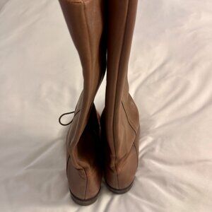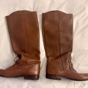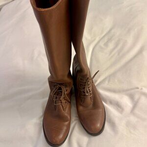 Vintage Saddle Tan Brown Leather Equestrian Riding Polo Boots Womans size 9. Pull on with laces. Branded inside on sole but unable to read. Made in Argentina. Good used condition. Some scuffs to leather and lite wear to soles but great overall. Shaft measures approx. 16" high, 7" wide laid flat, 3/4" heel. Great for riding or winter!