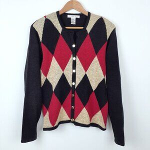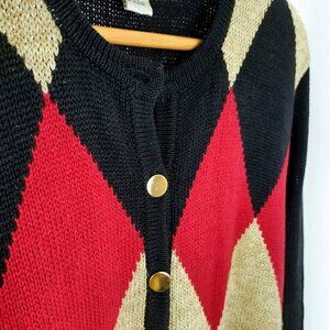 Vintage Argyle Cardigan, Size M. Red Black Gold Retro Holiday Button Up Lisa J