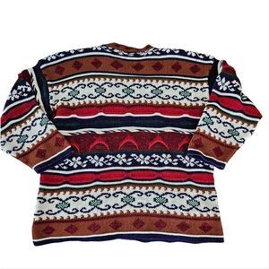 This is an '80s fashion classic. Features a chunky knit with 3D textured accents. Some of the patterns have metallic green and read threads woven through the design. The neckline is high - almost a mock neck. This vintage gem would look great matched with some leggings and boots or over some cute wide legged jeans. It is a vintage size 3. Based on the measurements, I'd call this a large. It is in very good vintage condition. There is some pilling throughout commiserate with age.