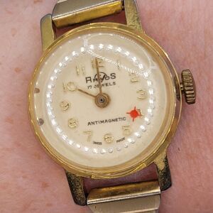 This charming vintage Arios watch features a classic round dial with a unique textured outer ring and a striking red star accent. Powered by a 17-jewel antimagnetic movement, it boasts a gold-tone case and a flexible Speidel USA expansion band, offering a touch of retro elegance.