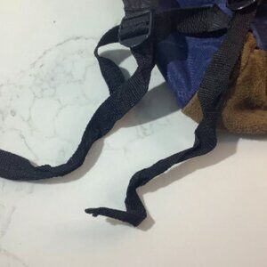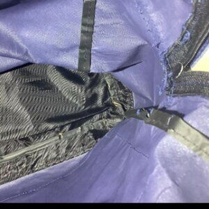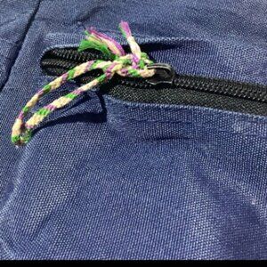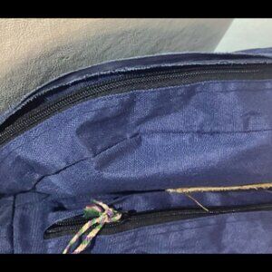 Measures approx. 15 inches by 12 inches. Front zipper is missing metal piece to zipper, there is a rope to pull it open. There is wear on edge where the zipper zips. And the straps on bottom are twisted. See above pictures for condition. Comes from a smoke free home.
