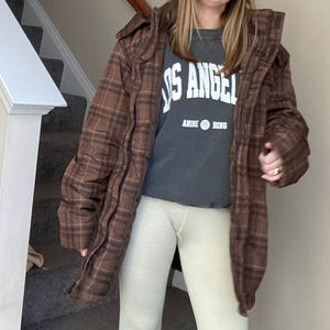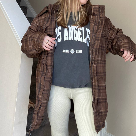 Vintage Arizona Jeans brown plaid puffer jacket. Excellent condition. Lots of pockets on exterior and one on interior. Detachable hood, weatherproof and warm. Longer throughout body. Vintage from 00's. Boys size XL 18/20...modeled on a size women's small. Would fit a women's small oversized, or medium regular/boxy. Super cute and trendy color, would go great with neutral outfits.