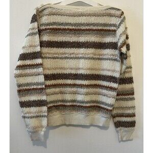 Cozy vintage sweater from Arlene, made in the USA and crafted from a soft 50% polyester / 50% rayon blend. Features a textured knit with horizontal stripes in warm, neutral tones of cream, taupe, beige, and rust. Classic pullover style with a timeless 80s vibe.