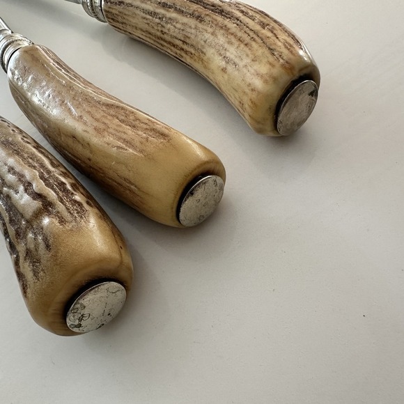 This vintage 3-piece Armack carving set brings Sheffield, England's renowned craftsmanship to your table. Featuring genuine stag horn handles, this set is a perfect blend of Mid Century Modern style and timeless utility.