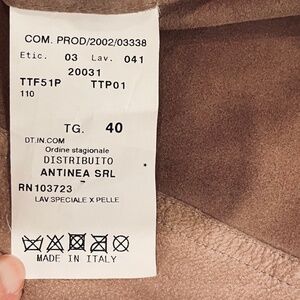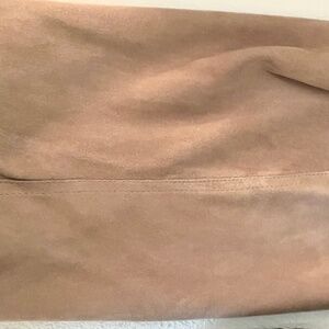 Armani Collezioni Vera Pelle Cropped Rushed Top/Jacket in silky, glove-quality lambskin suede. Size 4. 3/4 Sleeves. Fit is small and tight. Measures approximately: chest: 18 1/2 inches pit to pit, shoulder to hem line: 18 1/2 inches. Color: Beige (with a slight rose-tone). Composition: 100% Suede Leather. Condition: Very Good. Gently worn; well maintained; no unusual marks, holes, or rips. Minor wear and staining can be seen on sleeves and hem, and inside sleeves, but not very noticeable. Please see photos for details.