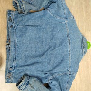 The jacket has a button closure and a point collar with accents such as collar and buttons. It is made of cotton outer shell material and lined with cotton, ensuring comfort and durability. This jacket is perfect for casual occasions and comes in a size 34 with a blue color.