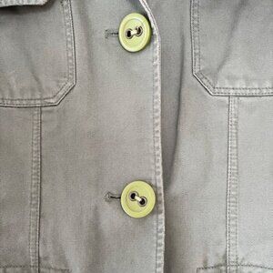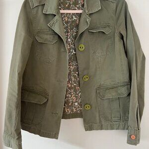Vintage army green jacket, women's size medium. Slightly distressed look with cute, flowered liner. Roomy enough for layering with expandable wrists. Big green buttons on the front and small orange buttons on the shoulders and wrists. Cargo-style pockets