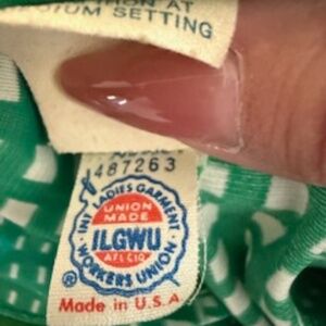 Vintage 1970s, International Ladies Garment Workers' Union, two-piece outfit featuring a zip-back top with neck tie detail and collar, and matching elastic waist band skirt, A-line cut.