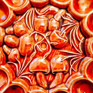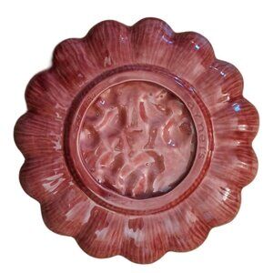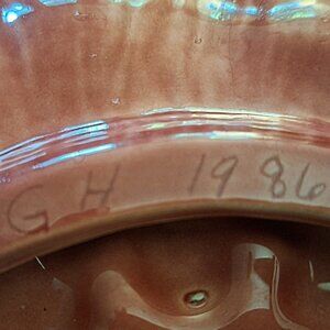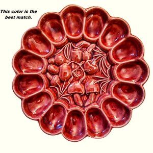 Rare vintage raw sienna 10 1/2" deviled egg plate with a mushroom design in the center. Will hold 15 deviled eggs. Center mushroom portion is 5 1/2" in diameter. Initialed G.H. 1986. Weights 2 pounds 4 ounces. Pre-owned, mint condition. No cracks, chips, flea bites, stains marks. Like new. Made in the U.S.A. Interested, make an offer. From a smoke and pet hair free home. Fast shipping.