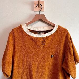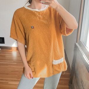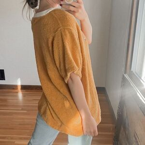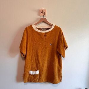 Vintage Arnold Palmer Distressed Terry T Shirt in Canary Yellow. Features Terry cloth fabric, intentional distress spots, contrast neckline, lower patch pocket, & relaxed fit. In good condition. No holes, rips, or stains. Ours is a pet & smoke free home.