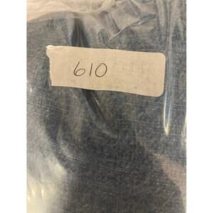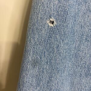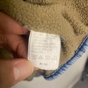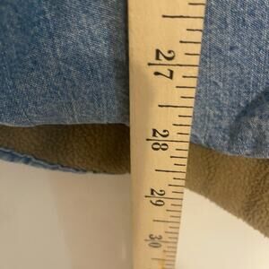 One small hole and stain in the arm. Shown in the pictures. Adds to the charm and style of this blue button down fleece lined shirt jacket.