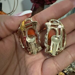 center. The stone is polished smooth and has an amber color to it. One earring is stamped 'Art Co' on the back. They are in excellent condition. Each measures 1" wide by 1-1/2" high.