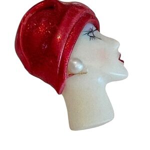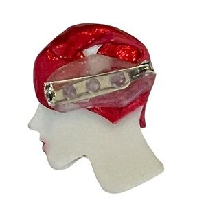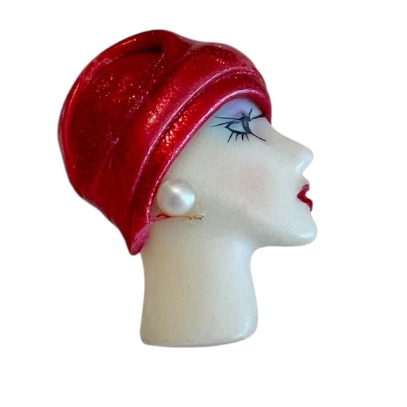This vintage brooch is a striking and unique piece, featuring an elegant Art Deco-inspired female profile with a bold red cloche hat and a pearl-like stud earring. The hand-painted details on the face, including dramatic lashes and red lips, add a touch of timeless glamour.