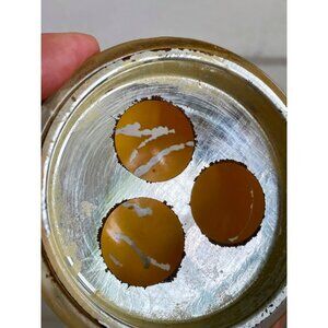 Here for your consideration is a round glass perfume holder for Duvinne perfume with three empty jeweled bottles inside. The holder should have a jewel on the top as is missing and it does have a bit of paint wear. The holder measures 3" tall and wide. The little bottles are 1 3/4" tall. No chips in any of the glass. Please see all pictures as flaws are shown.